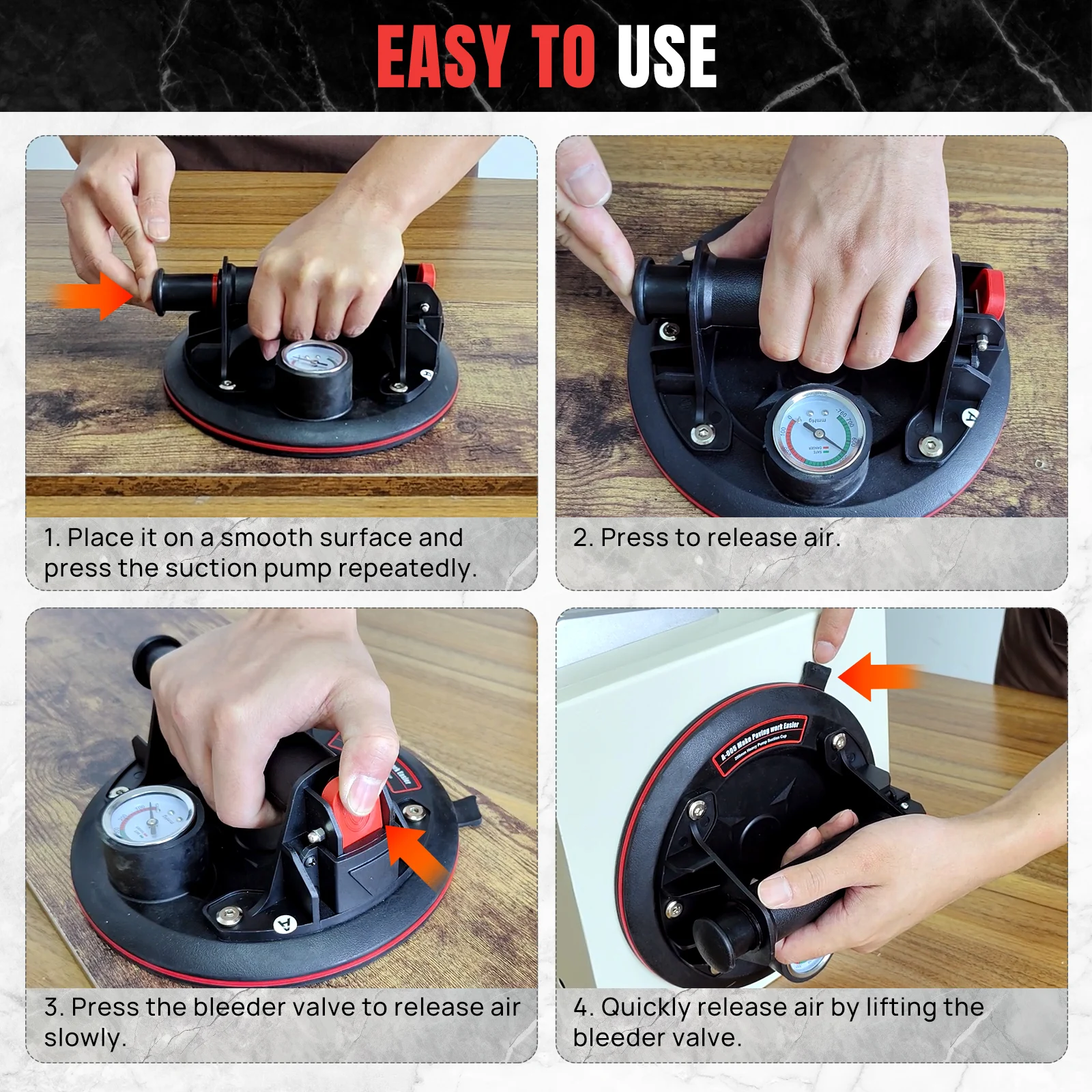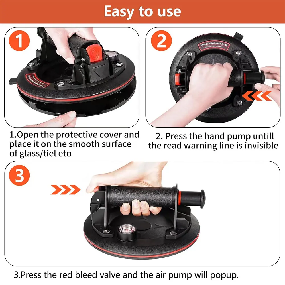 Paprasta naudoti – pirmiausia padėkite aplikacijos puodelius ant lygaus, be dulkių paviršiaus. Tiesiog kelis kartus paspauskite stūmoklį, kol raudona įspėjamoji linija išnyks, kad pasiektumėte vakuuminį sukibimą. Kai tai padarysite, atleiskite pakeliamąjį vakuuminį aplikacijos puodelį, greitai pakelkite skląstį ir galite pradėti.