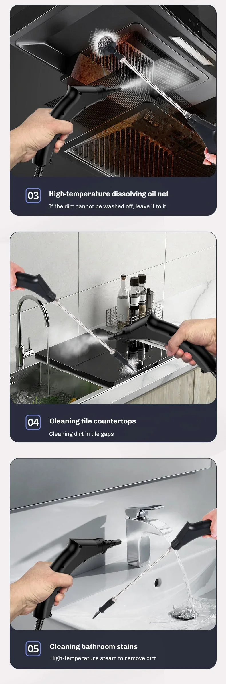 [Aukštos temperatūros ir slėgio garai] 2500 W didelės galios gali sukurti 120°C aukštos temperatūros ir 3 BAR slėgio garus per 10-15 sekundžių, efektyviai pašalindami sunkiai įsisenėjusius riebius nešvarumus ir dėmes.