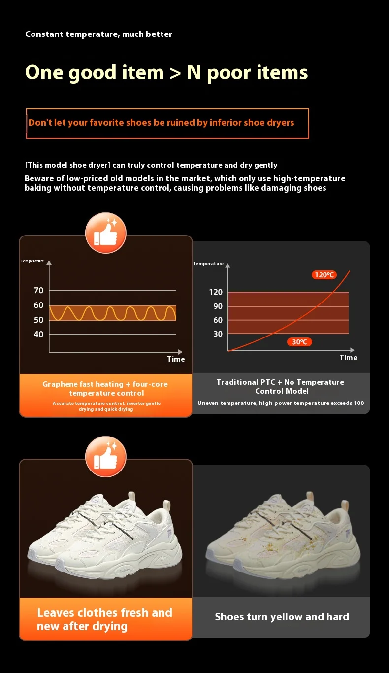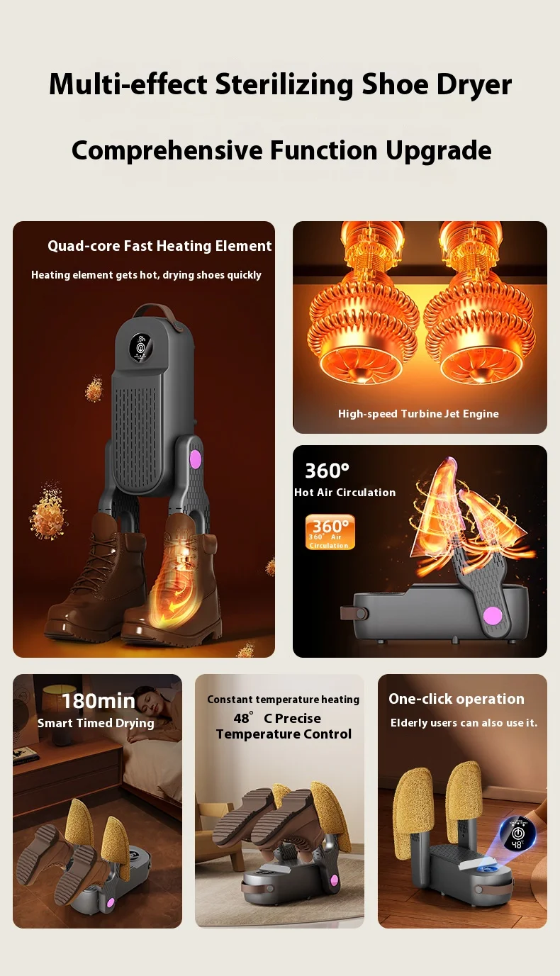 - Efektyviai išdžiovina dvi poras vienu metu: Šis galingas batų džiovintuvas turi daugiakryptes ventiliacijos angas, leidžiančias vienu metu išdžiovinti dvi batų poras.