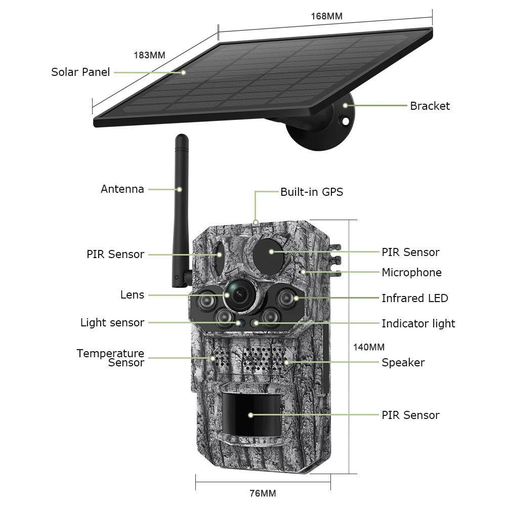 Nauja 4G Sim medžioklinė kamera apsaugai ar gyvūnų stebėjimui. Viduje turi 3vnt. 18650 akumuliatorių 7800 mAh talpos. Saulės panelės krovimą. Bei patogų valdymą per Ucon aplikaciją. Ganėtinai ryški kokybė ir dvigubas PIR leis aptikti judėsi iki 20 metrų. Bei interneto prieiga bet kada leis stebėti vaizdą gyvai, komunikuoti dvipusiu rėžimu ar gauti pranešimus į programėlę.