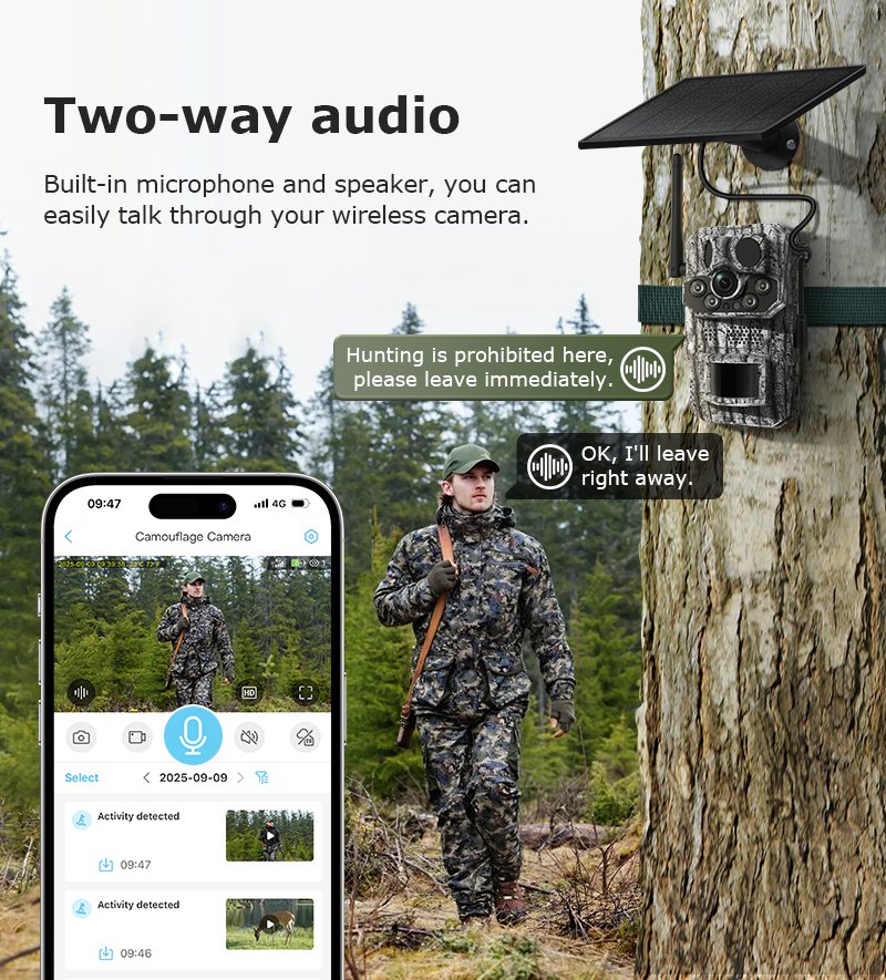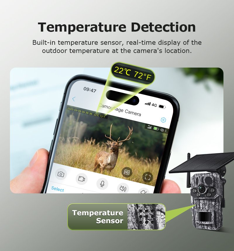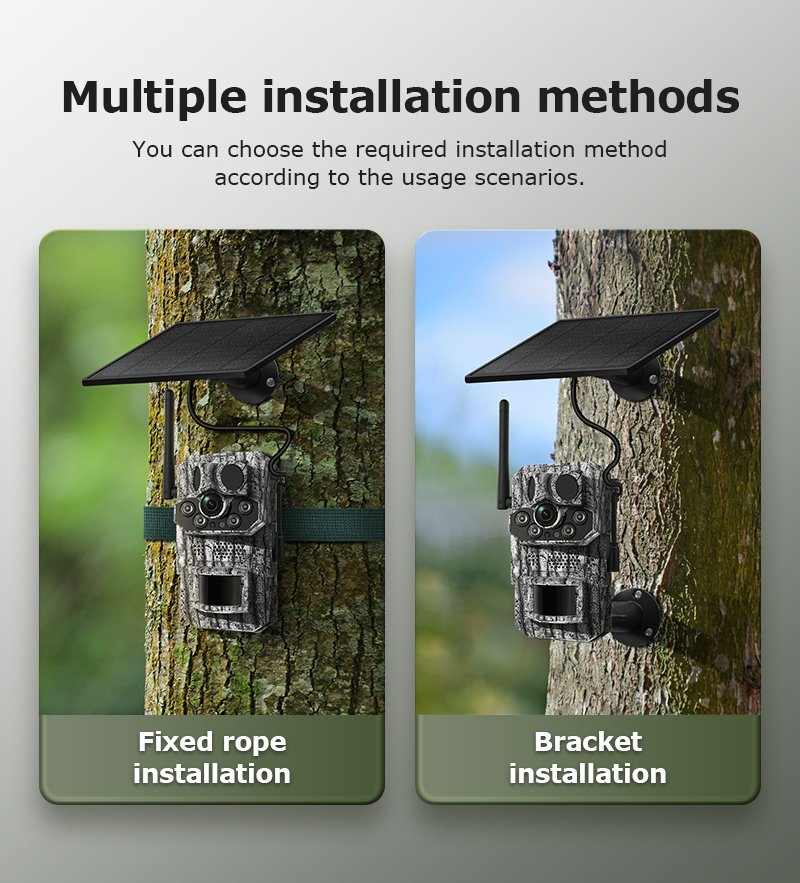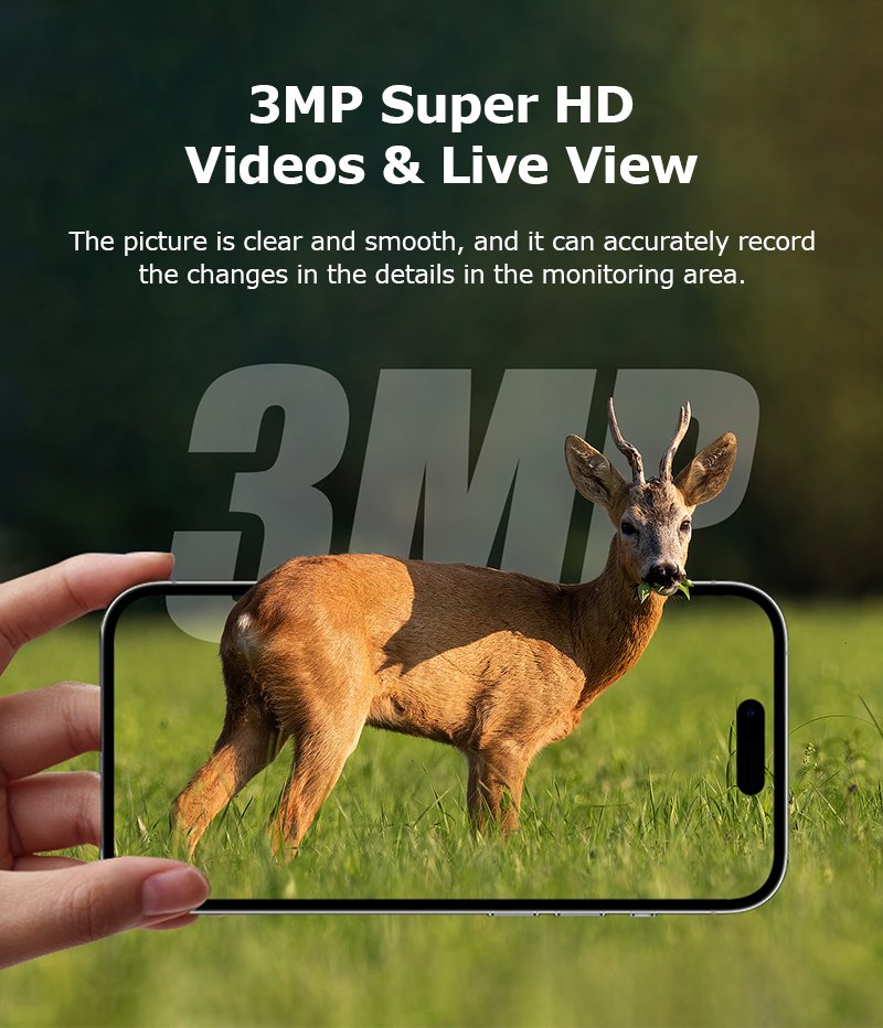 ST-HC808 saulės energija varoma takų kamera turi 3 PIR sistemą, kuri sujungia plataus kampo dvigubą PIR su didelio atstumo PIR jutikliu. Ji užtikrina 20 metrų aptikimo diapazoną, o suveikimo greitis – mažiau nei 0,5 sekundės, todėl tinka laukinės gamtos stebėjimui, lauko apsaugai ir ūkių apsaugai. 60° FOV pritaikytas juodos šviesos objektyvas fiksuoja aiškius 2304 × 1296 vaizdus 15 kadrų per sekundę greičiu.