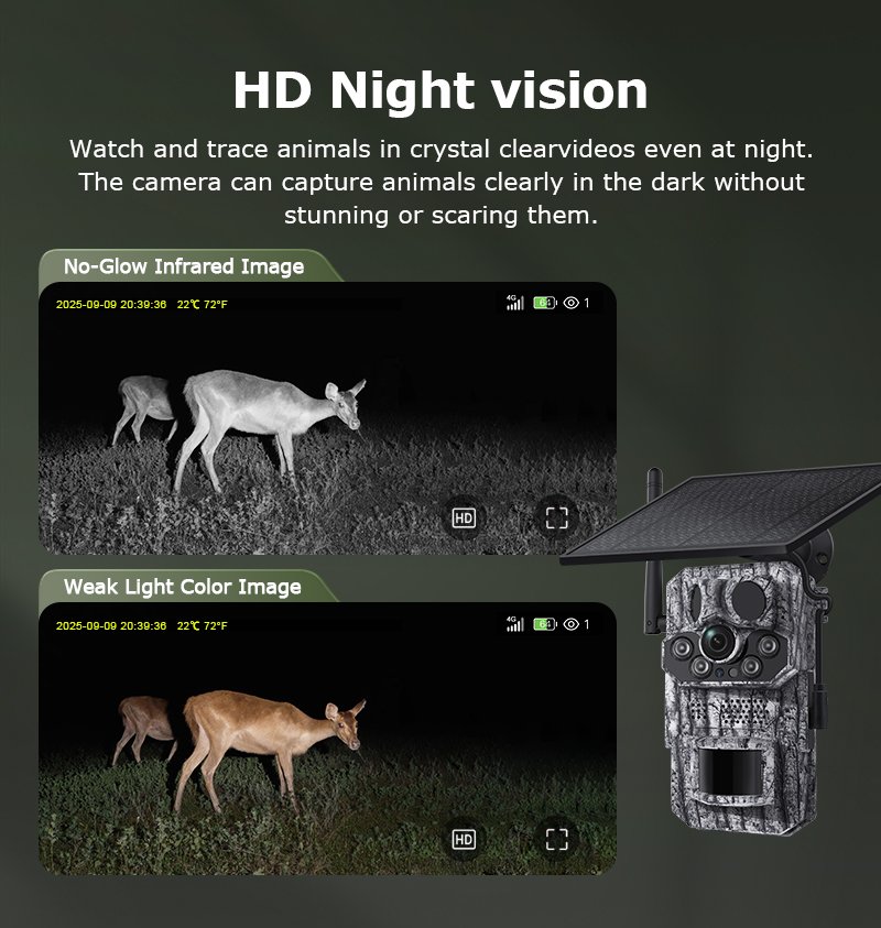 Naudodama SP2316 juodos šviesos jutiklį ir 1,6 diafragmos objektyvą, ši saulės energija varoma takų kamera pasiekia spalvotą naktinį matymą prasto apšvietimo aplinkoje. Nematomi 940 nm IR šviesos diodai užtikrina iki 20 metrų infraraudonųjų spindulių matomumą naktį netrukdydami gyvūnams, todėl ji idealiai tinka medžioklei, laukinės gamtos tyrimams ir naktiniam stebėjimui.