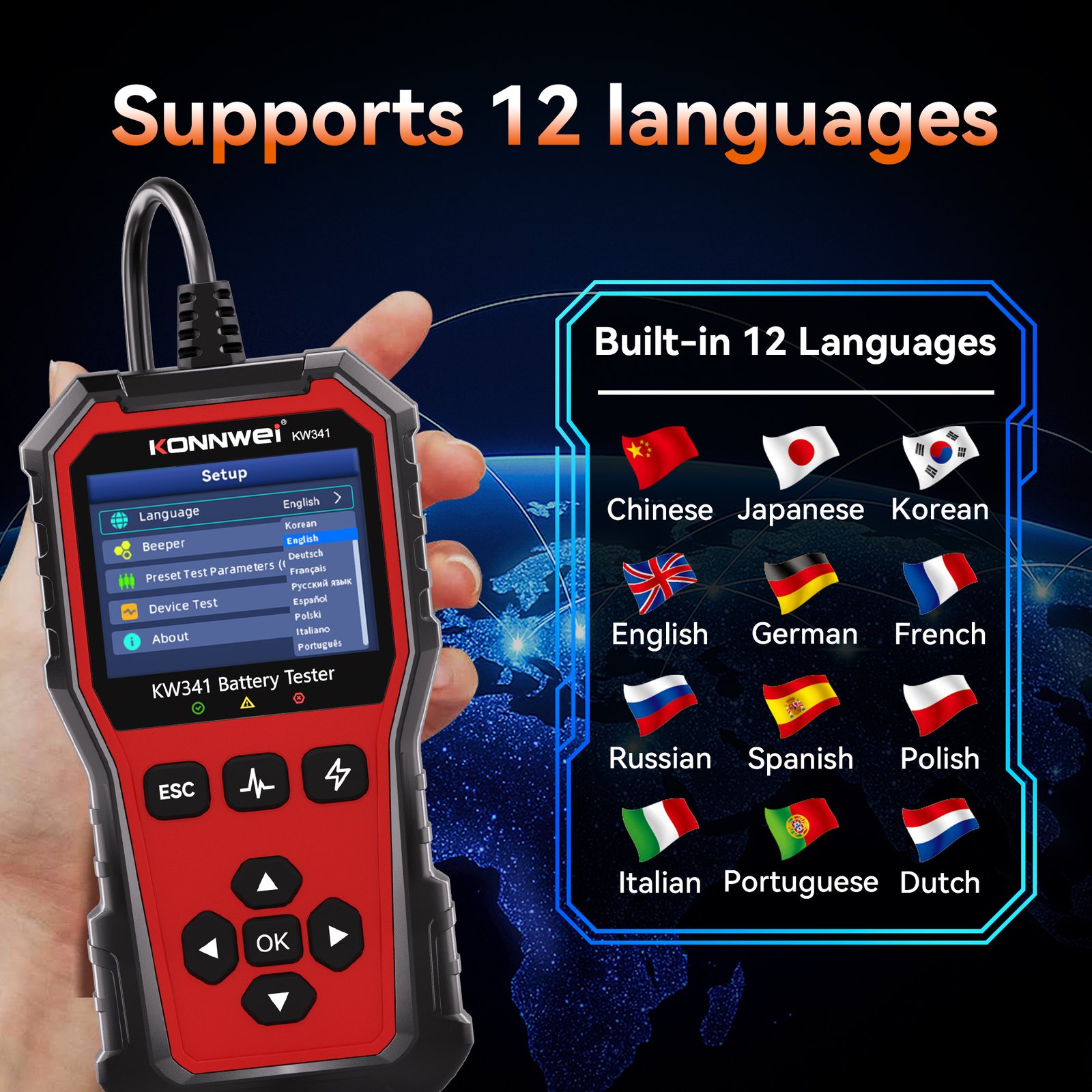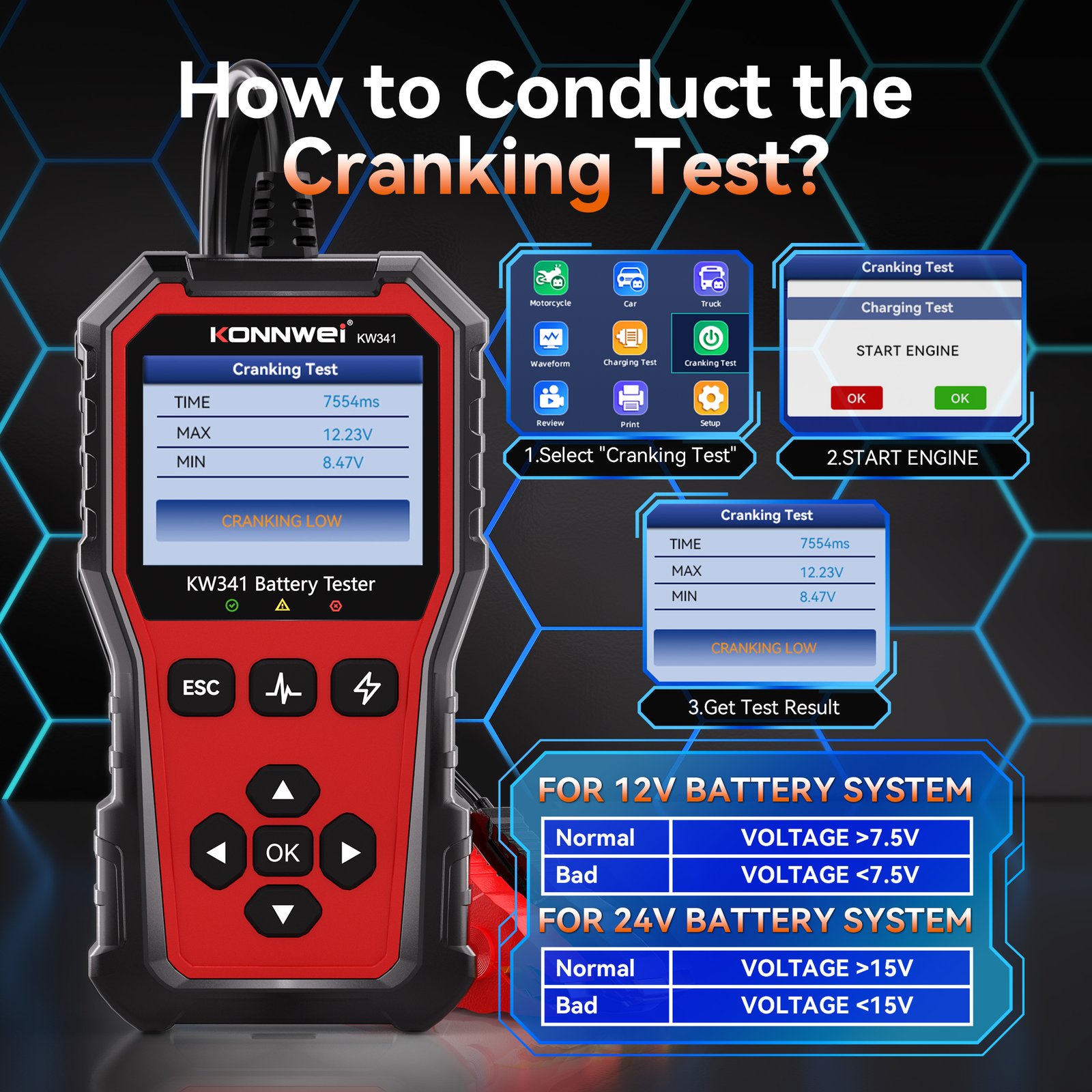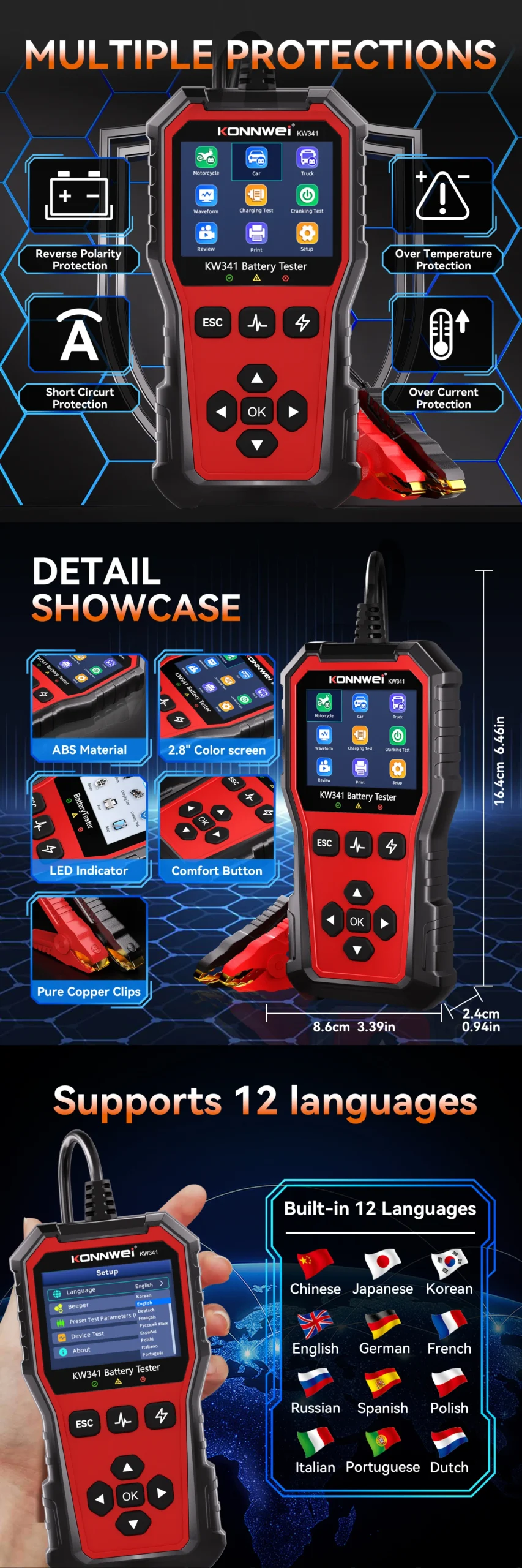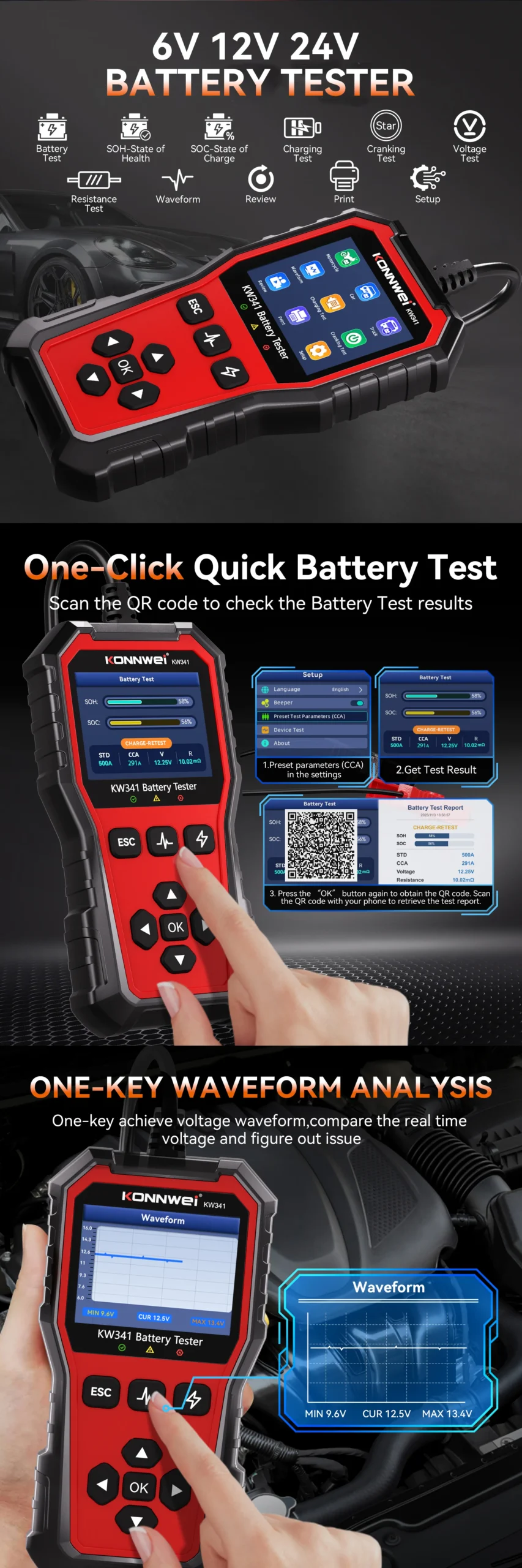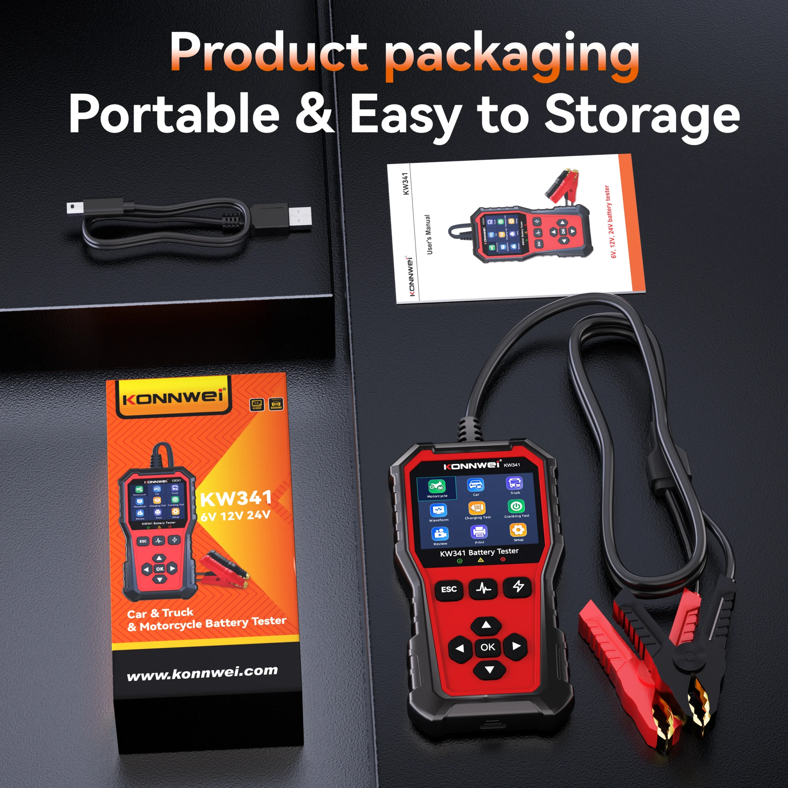 KONNWEI KW341 Akumuliatorių baterijų testeris analizatorius 6V, 12V, 24V su 2,8 colio spalvotu ekranu ir realaus laiko įtampos grafiku. Jis tikrina CCA, vidinę varžą, būklę ir įkrovimo sistemas švino-rūgšties, AGM, GEL ir EFB akumuliatoriams, kurių CCA svyruoja nuo (10) iki (2000). Jis palaiko spausdinimą iš kompiuterio, internetinius atnaujinimus ir daugiakalbę sąsają.