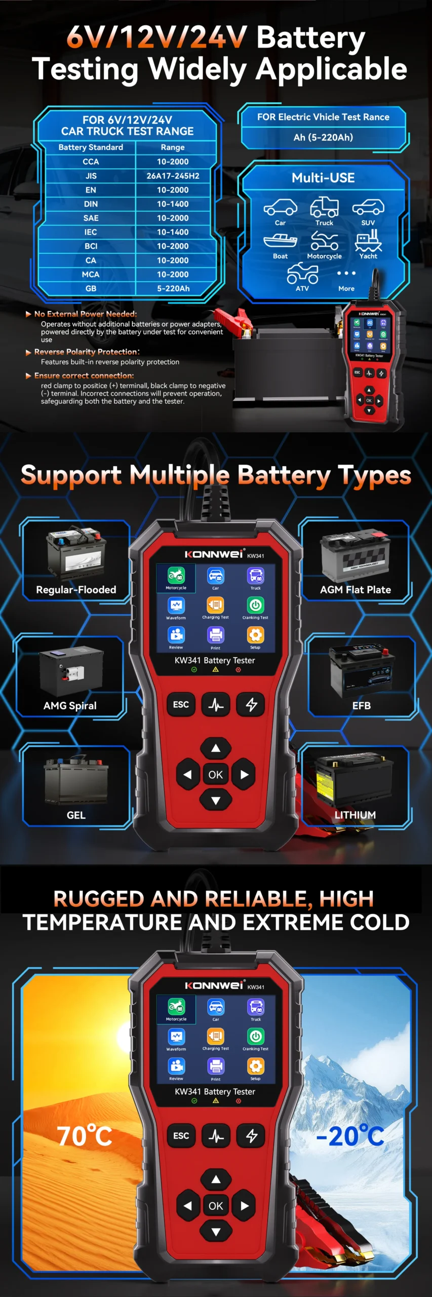 KW341 akumuliatoriaus testeris naudoja pažangiausią pasaulyje laidumo bandymo technologiją, kad lengvai, greitai ir tiksliai išmatuotų faktinę automobilio užvedimo akumuliatoriaus šalto užvedimo srovės galią, paties akumuliatoriaus būklę ir dažniausiai pasitaikančius automobilio užvedimo ir įkrovimo sistemų gedimus, o tai gali padėti techninės priežiūros personalui greitai ir tiksliai rasti problemą, taip užtikrinant greitą automobilio remontą.