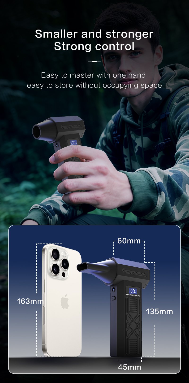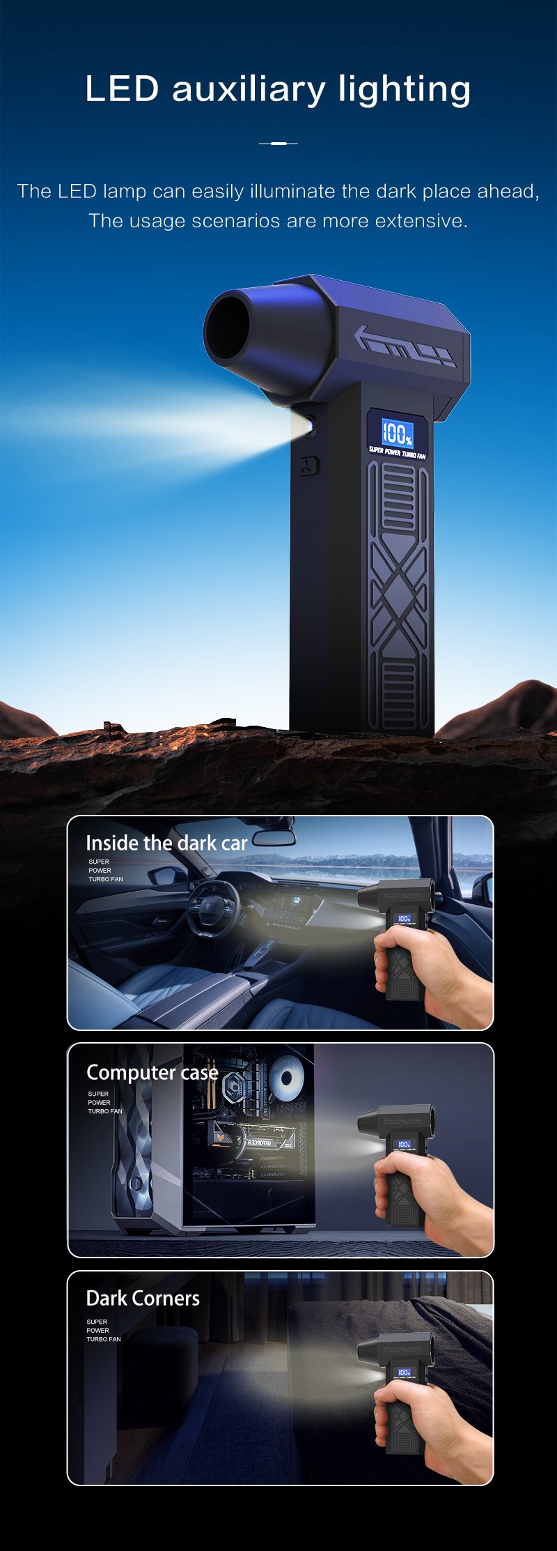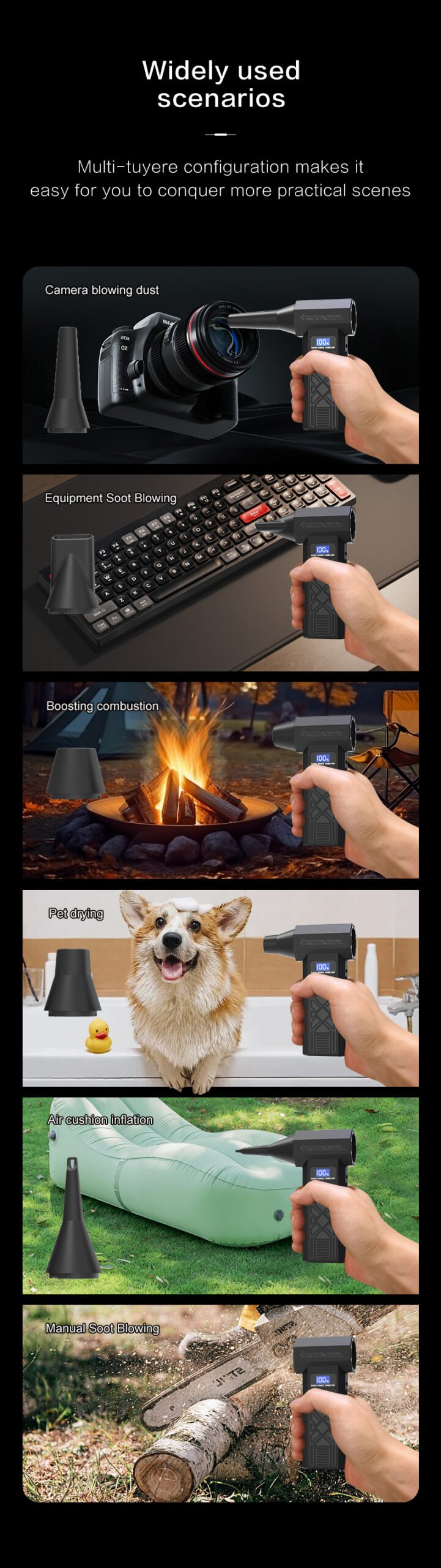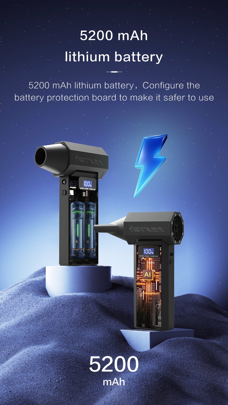 - Nešiojamas ir rankinis dizainas universaliam naudojimui – belaidis oro pūstuvėlis yra lengvas ir mažas pūstuvas. Dėl nešiojamo dizaino jis idealiai tinka namų, biuro ir automobilio salono valymui. Dėl tylaus veikimo ir triukšmo mažinimo funkcijų tai USB įkraunamas oro pūstuvas, kurį lengva naudoti ir kuris puikiai tinka dulkėms šalinti sunkiai pasiekiamose vietose.