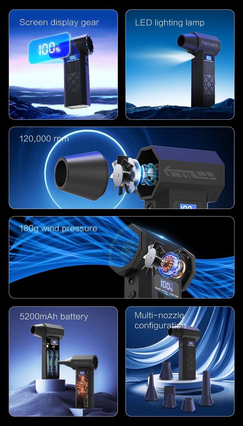 - Supergalingas turbo ventiliatorius efektyviam valymui – patirkite neprilygstamą valymo galią su elektriniu oro pūstuvu. Įrengtas didelio greičio 130 000 aps./min. turbo ventiliatorius, jis sukuria iki 41 m/s vėjo greitį, puikiai tinkantį dulkėms ir šiukšlėms valyti nuo kompiuterių, klaviatūrų ir kitos jautrios elektronikos. Šis suspausto oro pūstuvėlis, turintis kelis antgalių variantus, yra skirtas universaliam oro srautui, lengvai pasiekiančiam ankštas vietas ir plyšius. Nesvarbu, ar valote žaidimų kompiuterį, fotoaparato objektyvą ar kitus techninius įrenginius, šis elektrinis oro pūstuvėlis užtikrina kruopštų ir efektyvų valymą.